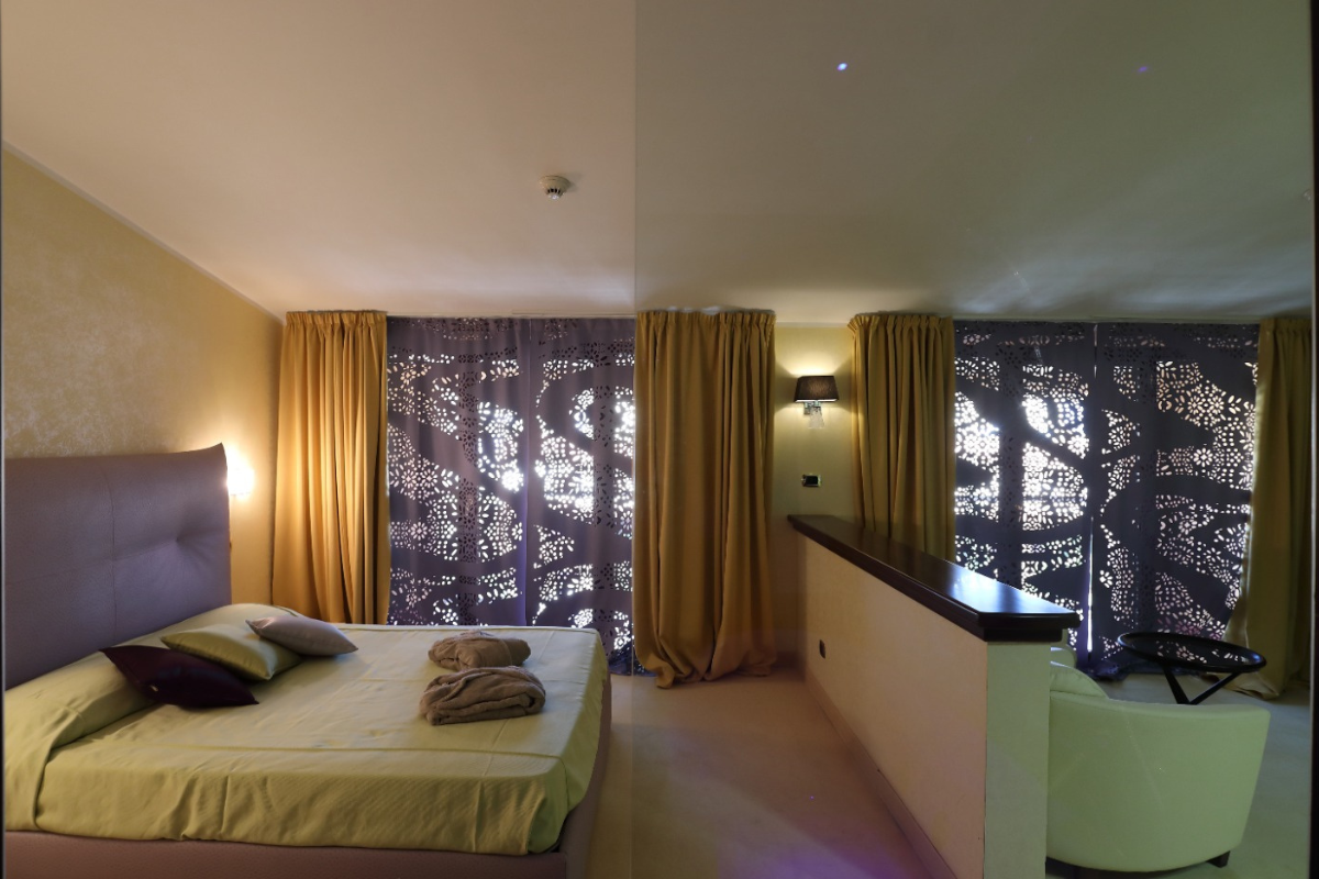 La Suite Soffione unisce design contemporaneo e wellness esclusivo. Le tonalità calde di bianco e giallo creano un'atmosfera accogliente, mentre la vasca idromassaggio rettangolare fronte letto regala momenti di puro piacere visivo. La doccia con cromoterapia aggiunge un tocco di benessere sensoriale, trasformando ogni momento in un'esperienza rigenerante. Camera matrimoniale con salottino, guardaroba, cassaforte, WiFi, bollitore, bagno separato e frigorifero completano questo spazio di lusso.